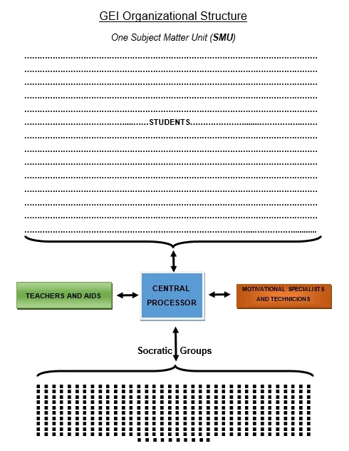 Since there would be many subjects and probably at least ten grade levels (These will be determined with use) GEI would consist of many SMUs. If the GEI supported five Subject-Matters over one grade level, for example, there would be five SMUs (one for each Subject-Matter) together capable of handling a total of 50,000 students and employing 810 Professionals(62 students per professional). Ten grade levels would involve 8,100 professionals and 500,000 students.